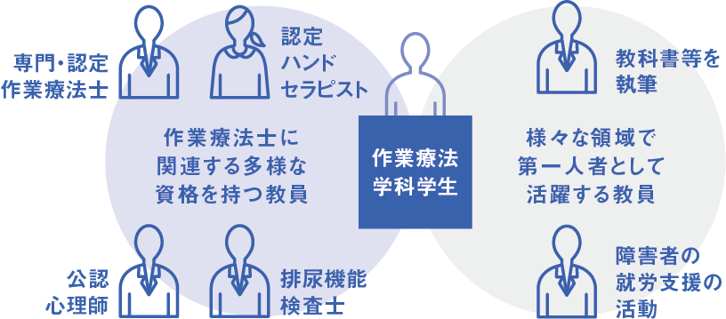 全国でも数少ない認定作業療法士や専門作業療法士(手外科)、認定ハンドセラピスト、排尿機能検査士、公認心理師など作業療法士に関連する多様な資格を持つ教員が多数在籍しています。また、全国の作業療法士養成校で使用されている教科書の執筆に携わる教員や障害者の就労支援の活動を行う教員など、様々な領域で第一人者として活躍している教師陣から指導を受けることができます。