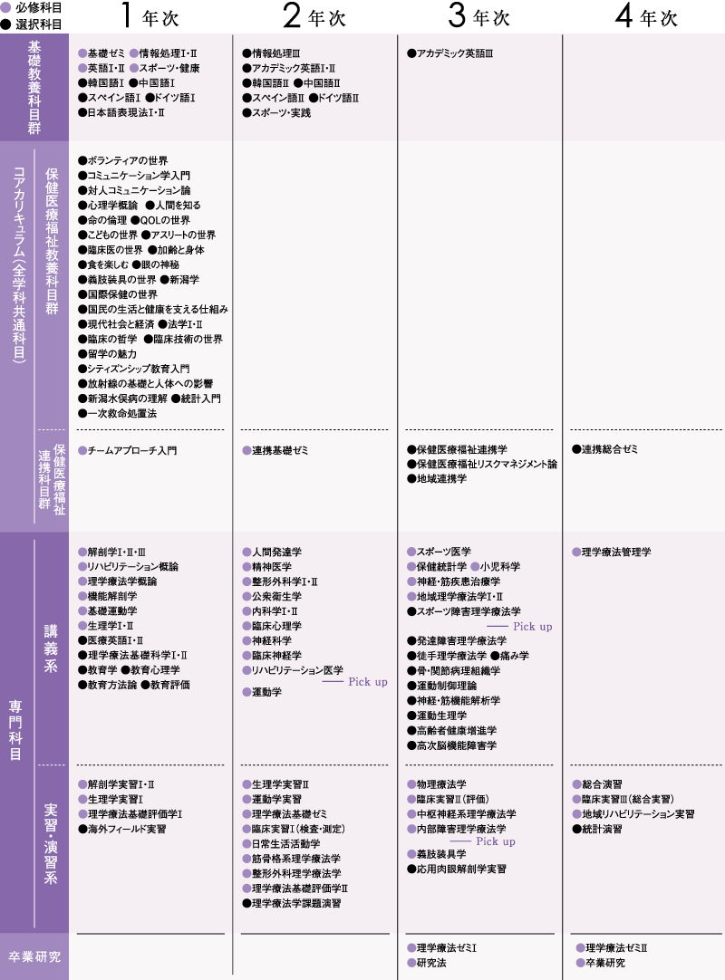 大学生としての基礎教養、教養科目を中心に学びます。 また、理学療法を学ぶために重要な基本的医学知識として解剖学、生理学、リハビリテーション概論などを学びます。 また、理学療法基礎評価学などの実技科目も組み込まれており、医学・理学療法を学ぶ学習姿勢が身につきます。