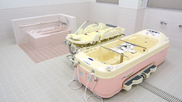 一般家庭の浴槽「一般浴槽」と寝たままで入浴ができるリフト付きの「機械浴槽」が蓄えられています。介護が必要な方の状況に応じた入浴援助方法を学びます。