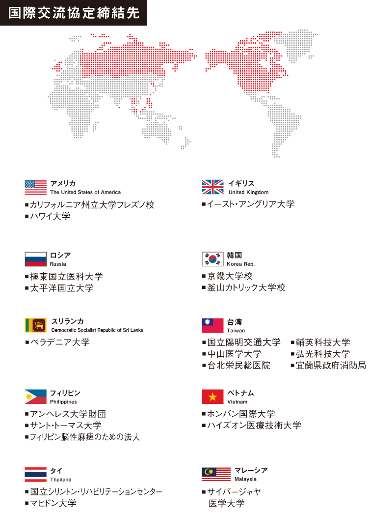 本学では、10ヵ国18大学4医療機関と国際交流協定などを締結し、国際的な視野を身につけるための多様な国際交流活動を実施しています。