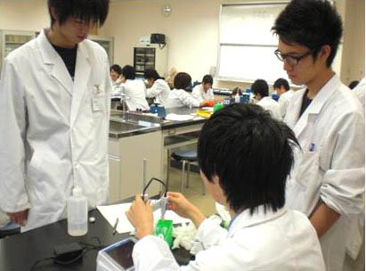生化学実習では緩衝液の調整やピペット(比較的少量の液体を一定容積吸い取って計量する科学実験機具の総称)を使った検査の操作法などの実力を身に付けます。